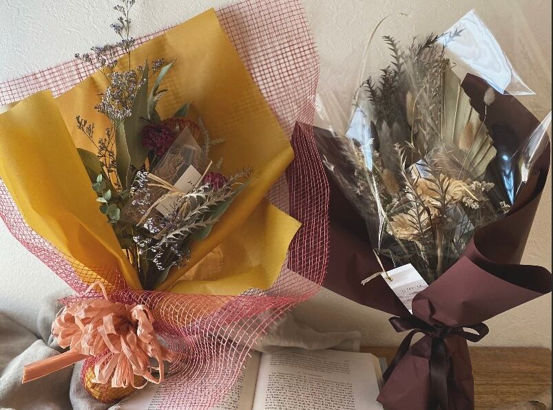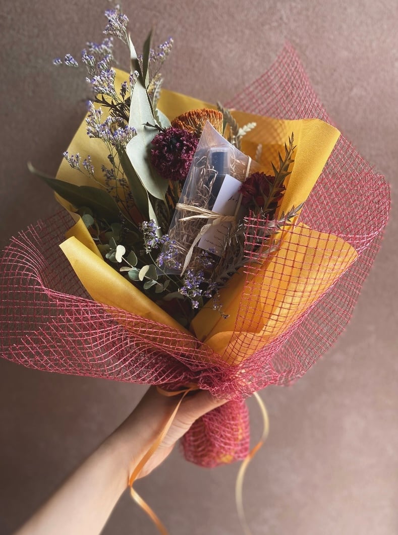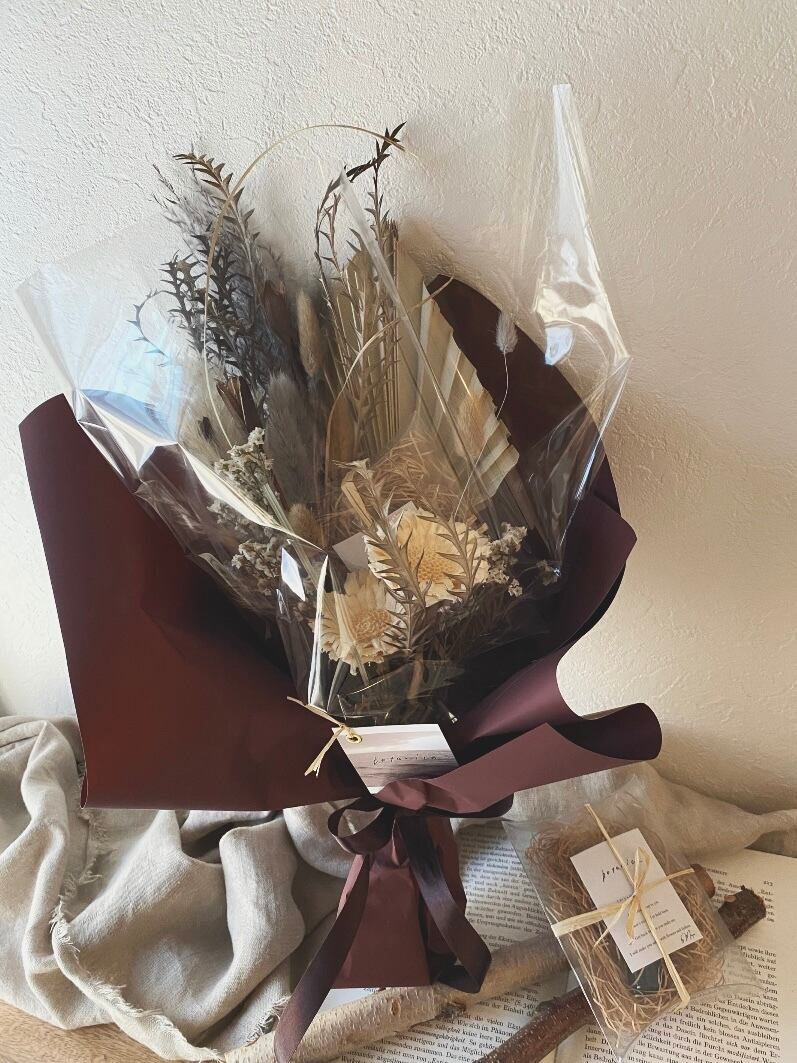 botanicaのドライフラワーとアロマスプレーをコーディネートしたブーケです。